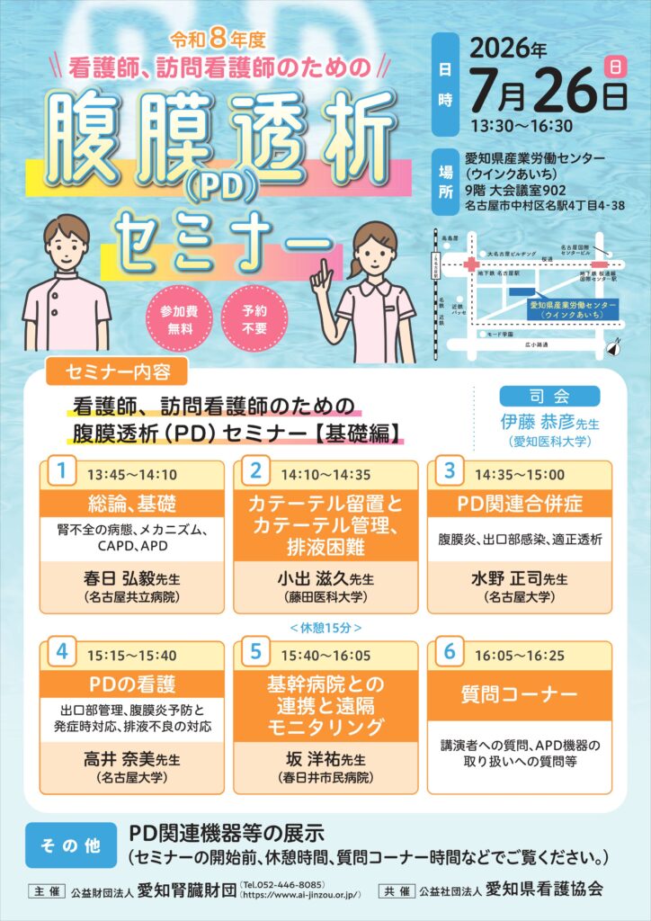 腹膜透析における訪問看護ステーションとの連携を円滑に進めるため、 愛知県内の施設を対象としたセミナーを開催します。